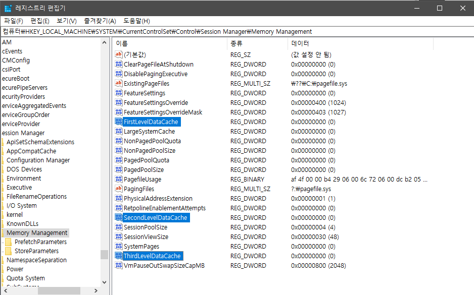 DWORD(32비트) 값을 FirstLevelDataCache, SecondLevelDataCache(기본생성되어 있음), ThirdLevelDataCache 이름으로 생성 합니다. 각각 L1, L2, L3캐쉬값입니다.