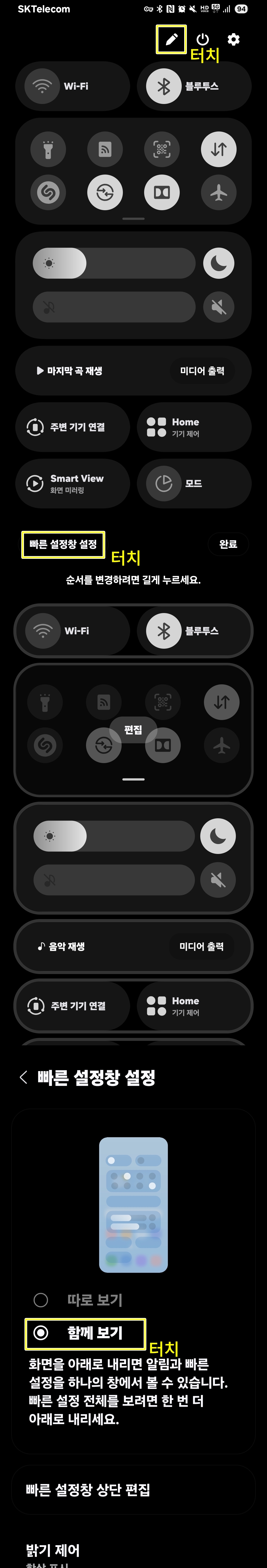 OneUI 7.X로 업그레이드 되면서 상단 알림창이 오른쪽내리면 설정만!, 왼쪽 내리면 알림만! 이렇게 분리가 되었습니다.